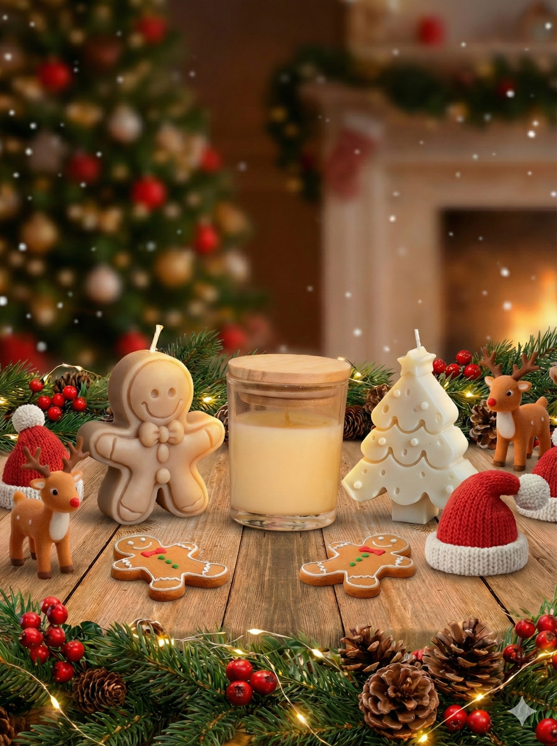 Vela de soya en molde con forma de figurita navideña, perfecta para decorar o regalar.
